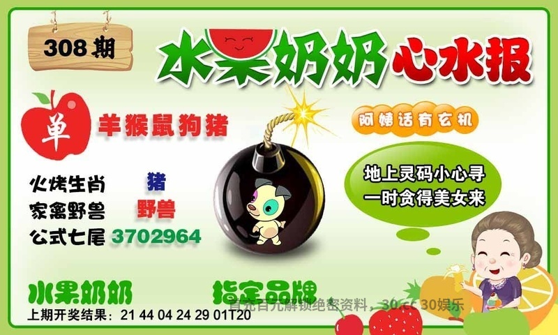 308期:地上灵码小心寻一时贪得美女来。 解:地上灵码小心寻一时贪得美女来,解羊猴鼠狗猪马。 六肖:羊猴鼠狗猪马。 平特一肖:猪猪猪。  |