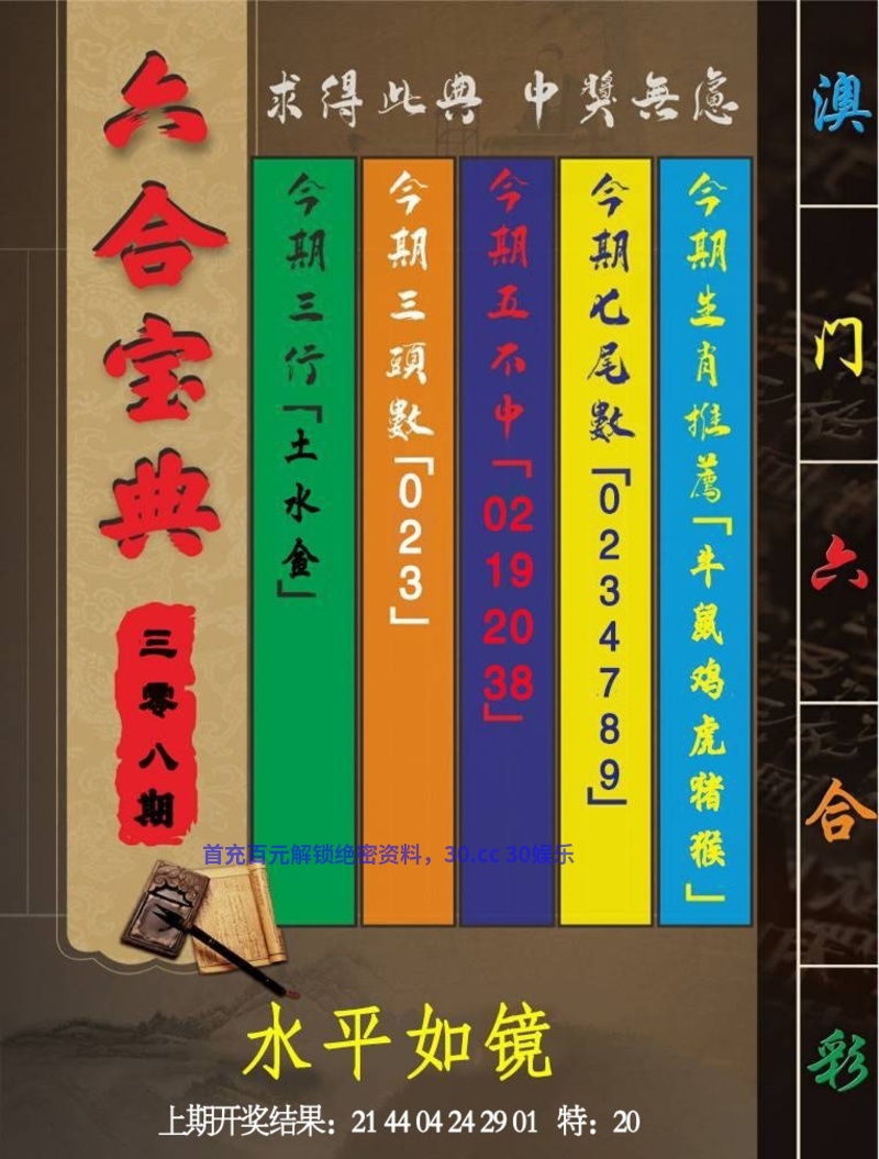 308期六合宝典《水平如镜》 ①图解特肖:鼠鸡牛虎猪猴 ②七尾中特:0234789 ③四码不中:02-19-20-38 本人取特都是有思路可寻,对错看天意,喷狗绕道  |